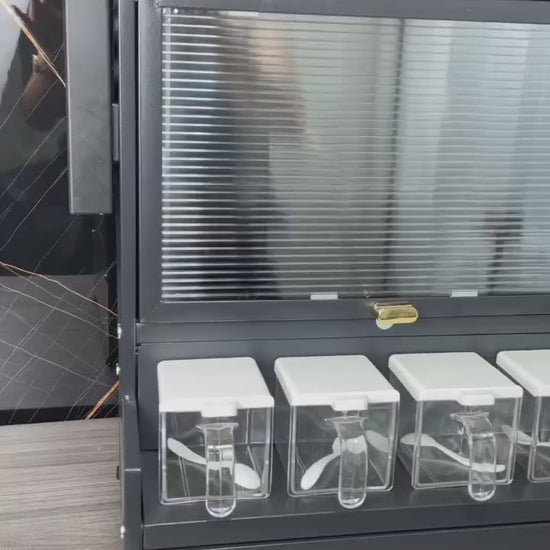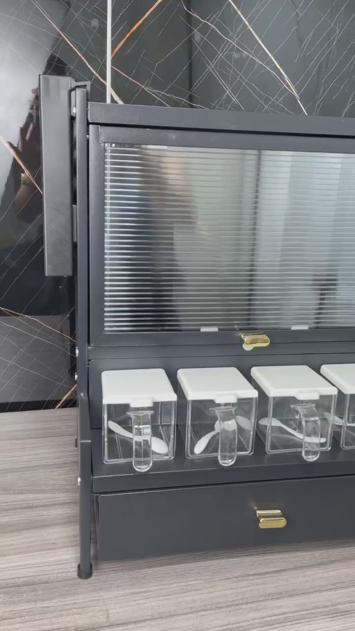 😱 Tiene una gaveta inferior para guardar artículos y cuatro envases transparentes para condimentos, cada uno con su propia cuchara.